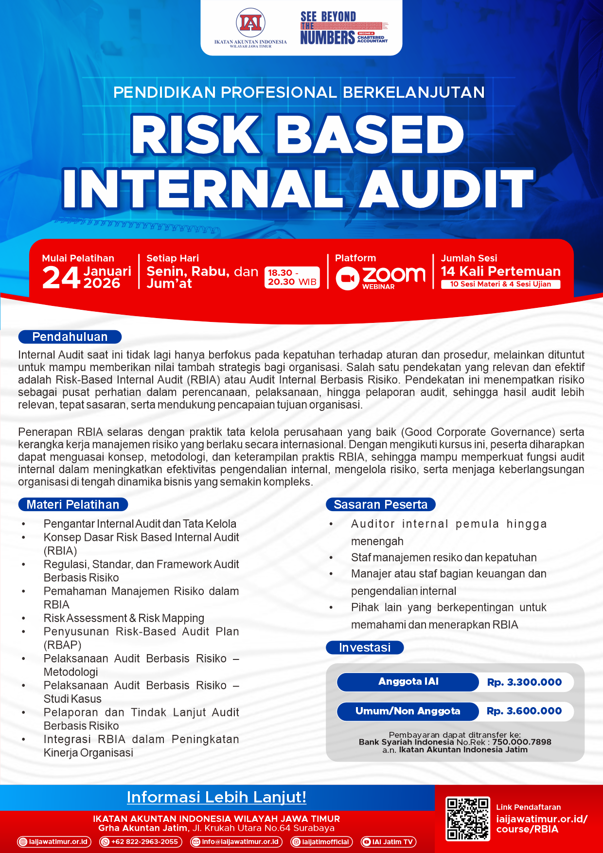 Penerapan RBIA selaras dengan praktik tata kelola perusahaan yang baik (Good Corporate Governance) serta kerangka kerja manajemen risiko yang berlaku secara internasional. Dengan mengikuti kursus ini, peserta diharapkan dapat menguasai konsep, metodologi, dan keterampilan praktis RBIA, sehingga mampu memperkuat fungsi audit internal dalam meningkatkan efektivitas pengendalian internal, mengelola risiko, serta menjaga keberlangsungan organisasi di tengah dinamika bisnis yang semakin kompleks.