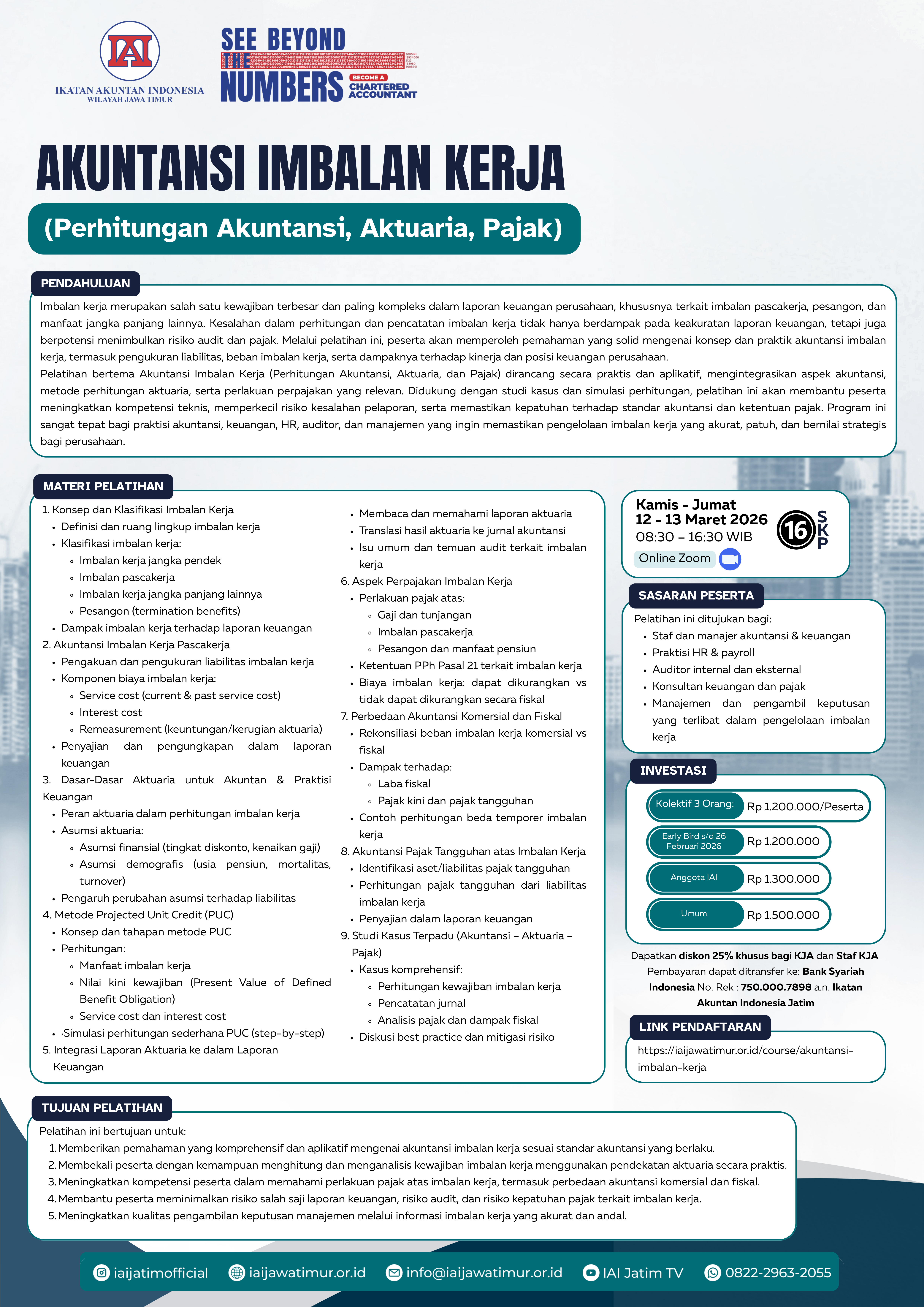 Pelatihan bertema Akuntansi Imbalan Kerja (Perhitungan Akuntansi, Aktuaria, dan Pajak) dirancang secara praktis dan aplikatif, mengintegrasikan aspek akuntansi, metode perhitungan aktuaria, serta perlakuan perpajakan yang relevan. Didukung dengan studi kasus dan simulasi perhitungan, pelatihan ini akan membantu peserta meningkatkan kompetensi teknis, memperkecil risiko kesalahan pelaporan, serta memastikan kepatuhan terhadap standar akuntansi dan ketentuan pajak. Program ini sangat tepat bagi praktisi akuntansi, keuangan, HR, auditor, dan manajemen yang ingin memastikan pengelolaan imbalan kerja yang akurat, patuh, dan bernilai strategis bagi perusahaan.