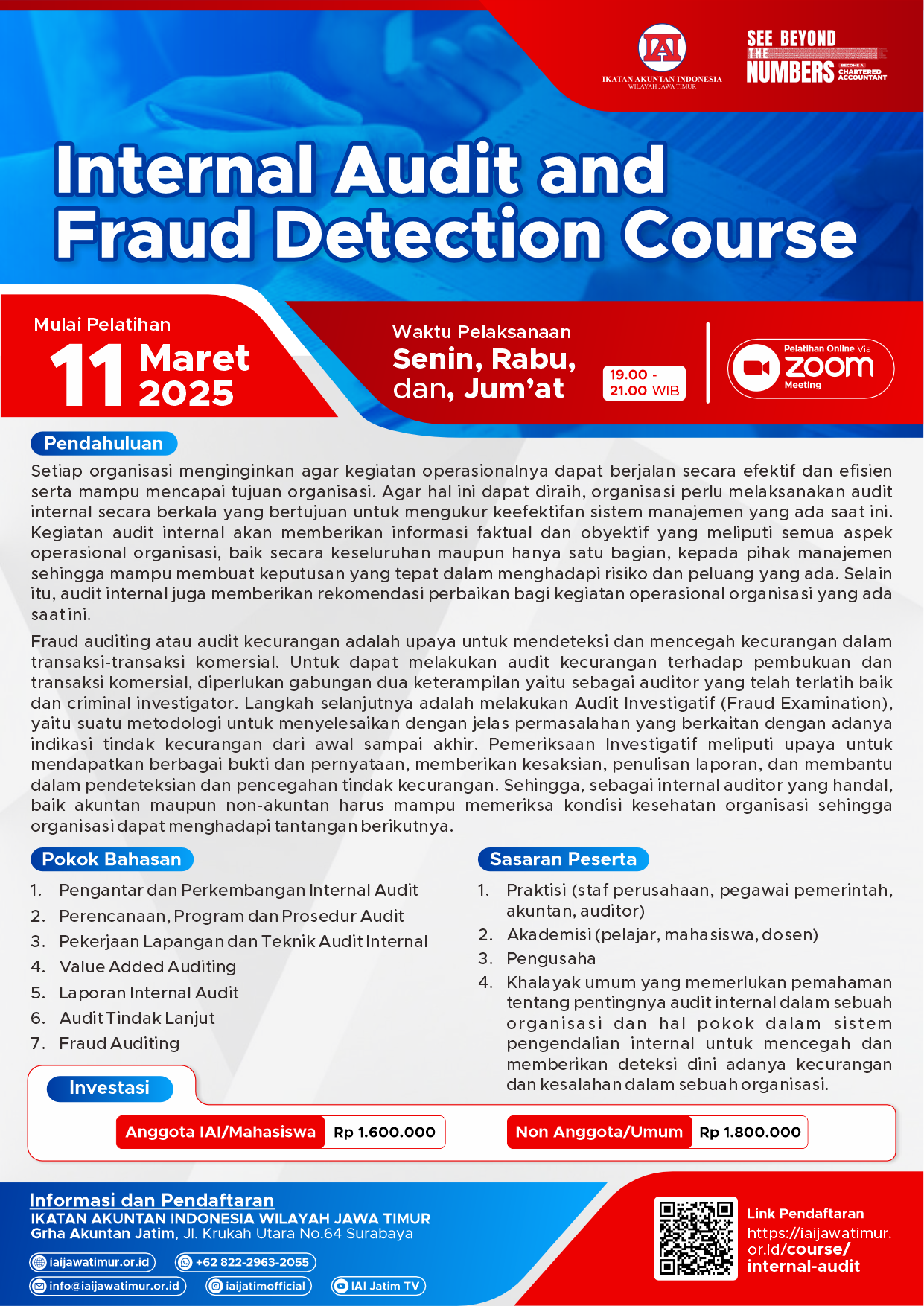 Setiap organisasi menginginkan agar kegiatan operasionalnya dapat berjalan secara efektif dan efisien serta mampu mencapai tujuan organisasi. Agar hal ini dapat diraih, organisasi perlu melaksanakan audit internal secara berkala yang bertujuan untuk mengukur keefektifan sistem manajemen yang ada saat ini. Kegiatan audit internal akan memberikan informasi faktual dan obyektif yang meliputi semua aspek operasional organisasi, baik secara keseluruhan maupun hanya satu bagian, kepada pihak manajemen sehingga mampu membuat keputusan yang tepat dalam menghadapi risiko dan peluang yang ada. Selain itu, audit internal juga memberikan rekomendasi perbaikan bagi kegiatan operasional organisasi yang ada saat ini.
