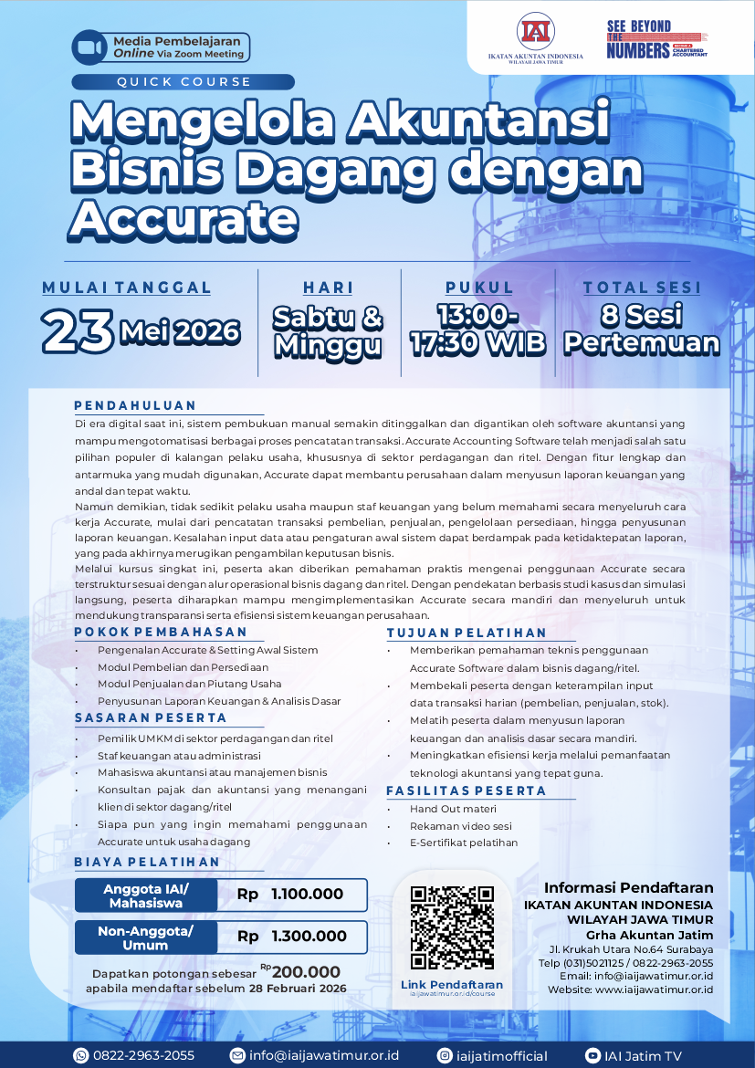 Melalui kursus singkat ini, peserta akan diberikan pemahaman praktis mengenai penggunaan Accurate secara terstruktur sesuai dengan alur operasional bisnis dagang dan ritel. Dengan pendekatan berbasis studi kasus dan simulasi langsung, peserta diharapkan mampu mengimplementasikan Accurate secara mandiri dan menyeluruh untuk mendukung transparansi serta efisiensi sistem keuangan perusahaan.