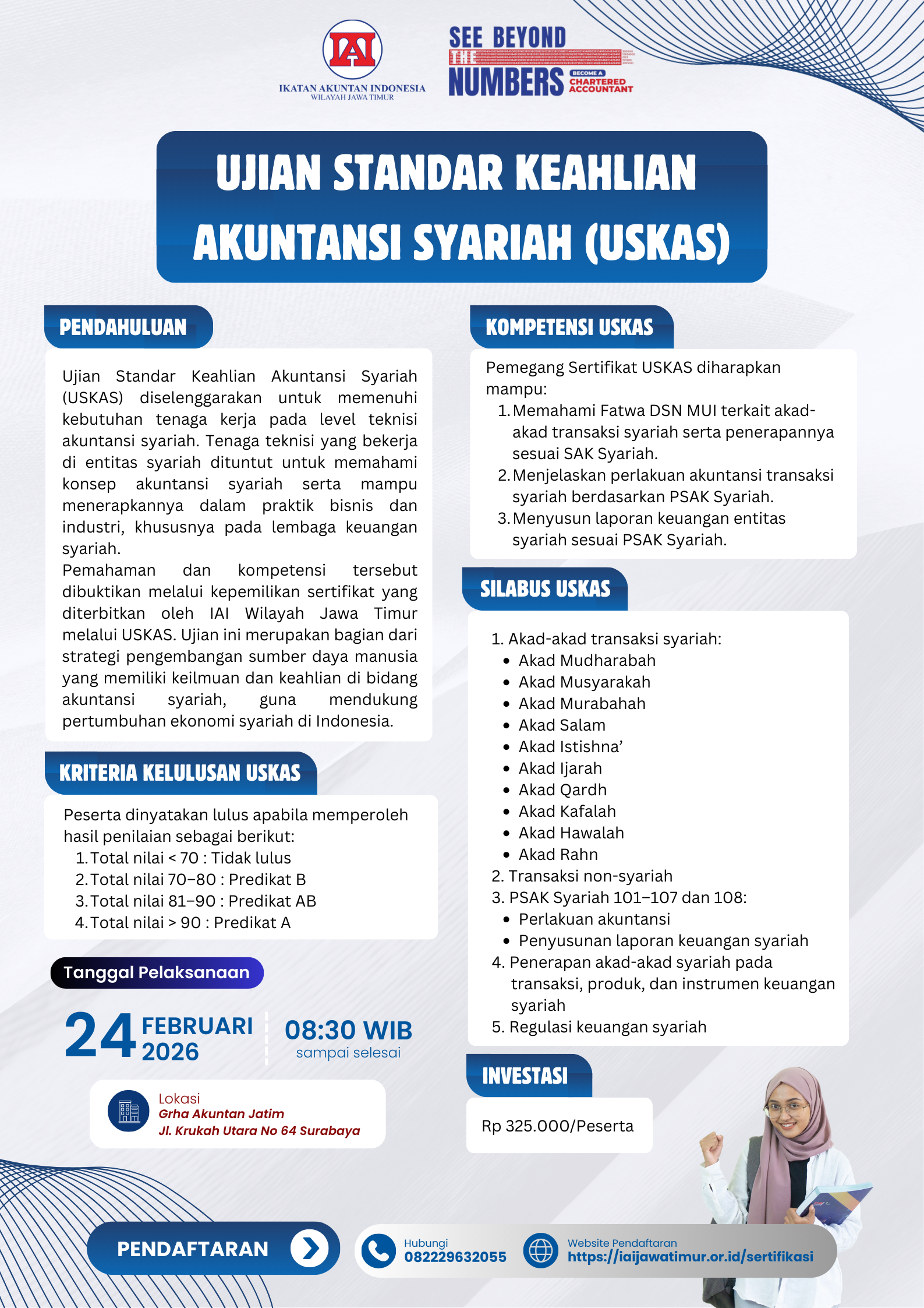 Ujian Standar Keahlian Akuntansi Syariah (USKAS) diselenggarakan untuk memenuhi kebutuhan tenaga kerja pada level teknisi akuntansi syariah. Para teknisi akuntansi syariah yang bekerja di entitas syariah harus memahami konsep akuntansi syariah dan mampu menerapkannya dalam dunia bisnis dan industri, khususnya yang bekerja di lembaga keuangan syariah. Pemahaman dan kemampuan tersebut harus dibuktikan dengan kepemilikan sertifikasi yang dikeluarkan oleh IAI Wilayah Jawa Timur melalui USKAS. Ujian Standar Keahlian Akuntansi Syariah merupakan suatu strategi pengembangan sumber daya manusia yang memiliki keilmuan dan keahlian Akuntansi Syariah dalam rangka mendorong perkembangan ekonomi syariah di Indonesia.