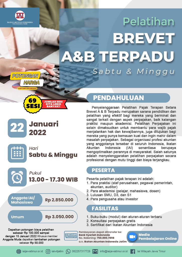 Telah dibuka pendaftaran kelas Online Akuntansi Syariah Terapan mulai kelas 22 Januari 2022 (Setiap Sabtu dan Minggu) Pukul 13.00 – 17.30 WIB.