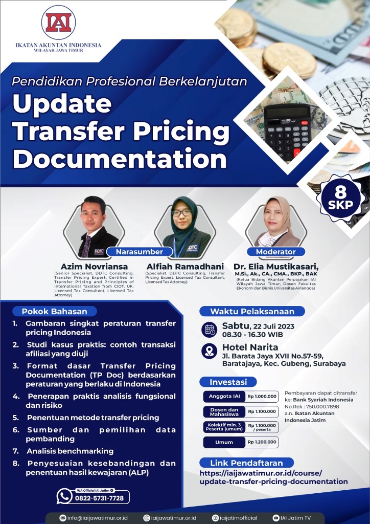 IAI Wilayah Jawa Timur menyelenggarakan Pendidikan Profesional Berkelanjutan (PPL) Diskusi dengan tema Update Transfer Pricing Documentation dengan tujuan memberikan update mengenai Transfer Pricing Documentation. Lanskap perpajakan internasional dan transfer pricing terus mengalami perkembangan secara signifikan. Perubahan-perubahan yang terjadi membuat entitas usaha yang menjalankan transaksi intragrup perlu menyusun Transfer Pricing Documentation (TP Doc – dokumentasi transfer pricing) yang optimal. TP Doc saat ini menjadi hal yang sering dibahas dalam dunia perpajakan. TP Doc bukan merupakan instrumen untuk melakukan penghindaran pajak, tetapi memiliki tujuan memaksimalkan laba dari sebuah perusahaan dengan melalui penentuan harga barang maupun jasa oleh satu unit organisasi dari perusahaan terkait dengan organisasi lain, naun masih dengan perusahaan yang sama. Regulasi yang membuat TP Doc menjadi popular adalah PMK Nomor 213/PMK.03/2016 mengenai jenis dokumen atau informai tambahan yang wajib disimpan oleh wajib pajak yang melakukan transaksi dengan pihak yang memiliki hubungan istimewa, dan tata cara pengelolaannya. Di dalam TP Doc para wajib pajak berkewajiban untuk mengungkapkan pihak-pihak yang terafiliasi dengan wajib pajak, jenis transaksi yang dilakukan, dan besar transaksi yang dilakukan berdasarkan fakta dan kondisi yang sebenarnya atau dengan kata lain saat transaksi berlangsung dimulai dari awal periode. Saat ini, jika akan melakukan transaksi afiliasi dalam dengan batasan tertentu maka diwajibkan untuk mendokumentasikan TP Doc.